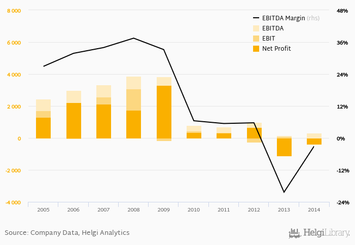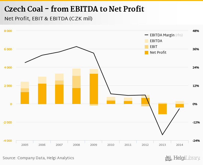 Czech Coal made a net profit of CZK -375 mil with revenues of CZK 1,810 mil in 2014, up by 66.2% and down by 61.8%, respectively, compared to the previous year. This translates into a net margin of -20.7%.