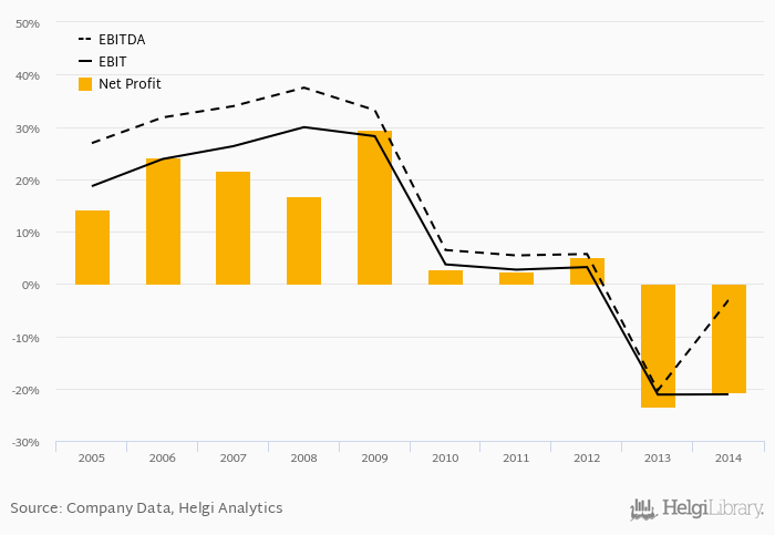 On the operating level, the EBITDA margin reached -3.10% and EBIT amounted to -21.1% of sales in 2014.