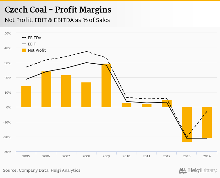 Czech Coal made a net profit of CZK -375 mil with revenues of CZK 1,810 mil in 2014, up by 66.2% and down by 61.8%, respectively, compared to the previous year.