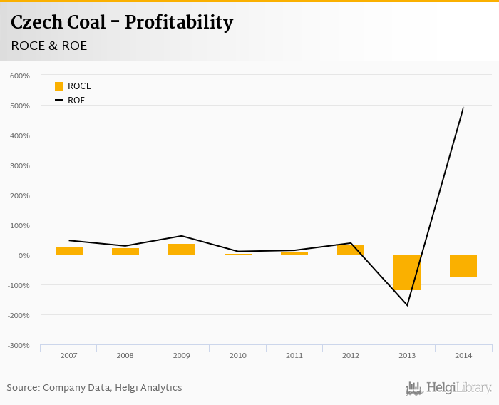As far as Czech Coal's peers are concerned, JSW generated ROE of -8.44% and ROCE of -5.41% in 2014. Carbounion Bohemia's profitability reached 20.1% and 34.4%, respectively. OKD operated with 1,922% and -78.2% returns in 2014.