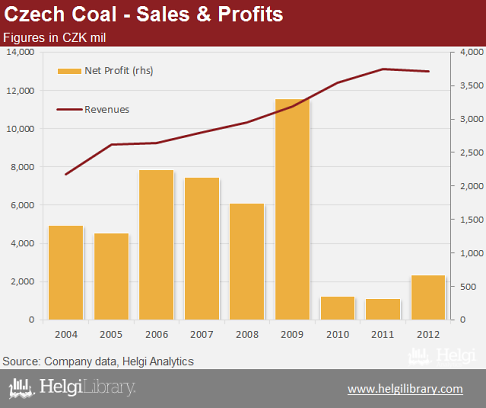 Czech Coal's sales reached nearly CZK 13 bil in 2012, up from CZK 7.6 bil in 2004. The net profit dropped to CZK 668 mil in 2012, down from nearly CZK 3.3 bil in 2009