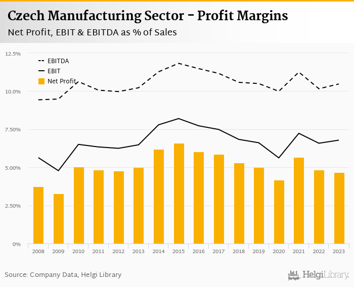 Czech Manufacturing Sector made a net profit of CZK 265,013 mil with revenues of CZK 5,669,187 mil in 2023, down by 1.95% and up by 1.86%, respectively, compared to the previous year.