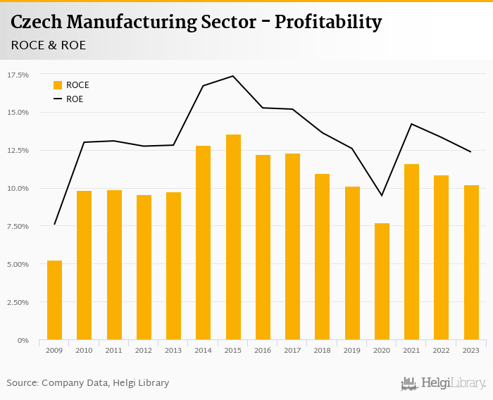 Czech Manufacturing Sector made a net profit of CZK 265,013 mil in 2023, down 1.95% compared to the previous year. Historically, between 2009 and 2023, the company's net profit reached a high of CZK 273,068 mil in 2021 and a low of CZK 90,627 mil in 2009.