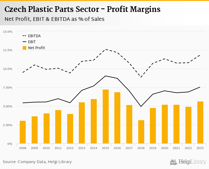 Czech Plastic Parts Sector made a net profit of CZK 11,893 mil with revenues of CZK 210,225 mil in 2023, up by 9.69% and down by 4.18%, respectively, compared to the previous year.