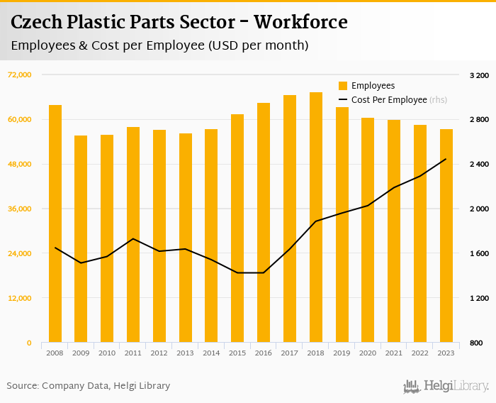 Czech Plastic Parts Sector employed 57,576 employees in 2023, down 1.73% compared to the previous year. Historically, between 2008 and 2023, the firm's workforce hit a high of 67,359 employees in 2018 and a low of 55,723 employees in 2009.