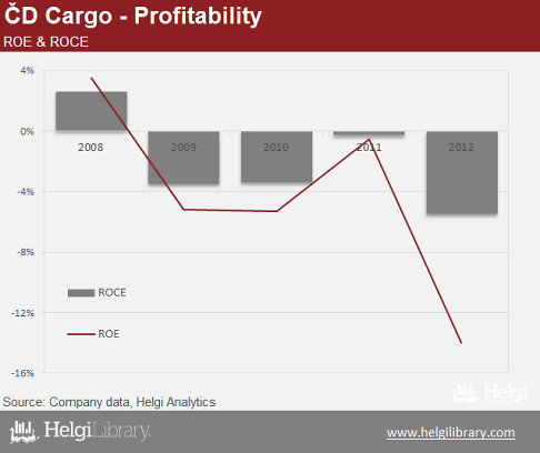 Despite being in the right business (at least theoretically), CD Cargo has booked a total cumulated loss of nearly CZK 1.7 bil in the last four years. In 2012 alone, the Company's loss has wiped out further 13% of the 2011 equity