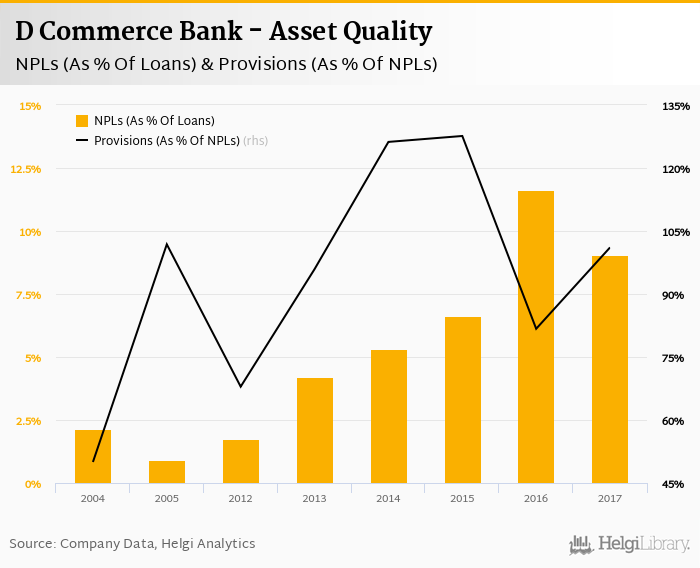 D Commerce Bank's non-performing loans reached 9.03% of total loans at the end of 2017, down from 11.6% compared to the previous year. Historically, the NPL ratio hit an all time high of 11.6% in 2016 and an all time low of 0.894% in 2005.