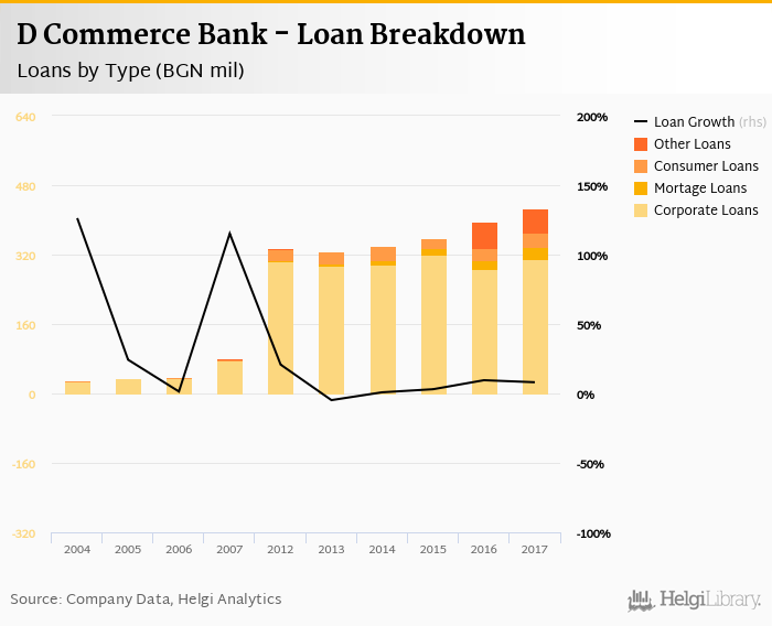 D Commerce Bank's loans reached BGN 426 mil in the 2017, up from BGN 396 mil compared to the previous year. Historically, the bank’s loans reached an all time high of BGN 426 mil in 2017 and an all time low of BGN 29.7 mil in 2004.
