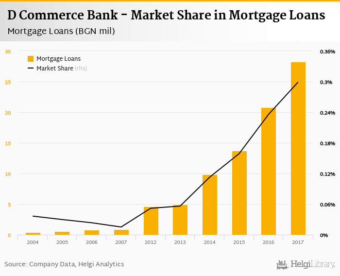 D Commerce Bank accounted for 0.299% of all mortgage loans issued in Bulgaria at the end of 2017. Historically, the bank’s market share in mortgage loans reached an all time high of 0.299% in 2017 and an all time low of 0.015% in 2007.