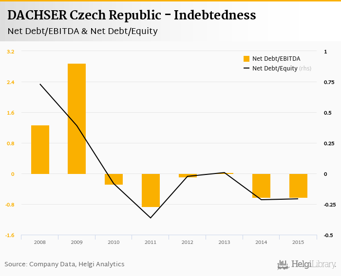 DACHSER Czech Republic's net debt stood at CZK -91.9 mil and accounted for -0.207 of equity at the end of 2015. The ratio is up 0.007 pp compared to the previous year.