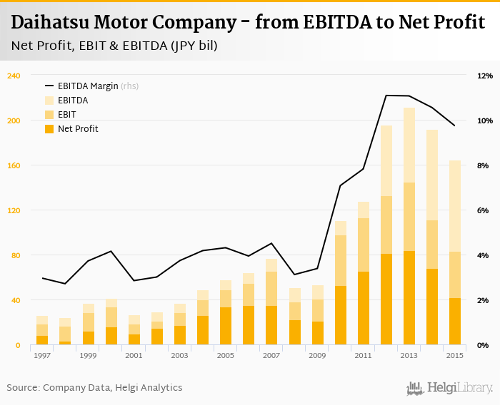 Daihatsu Motor Company made a net profit of JPY 41.9 bil with revenues of JPY 1,690 bil in 2015, down by 38.5% and down by 6.98%, respectively, compared to the previous year. This translates into a net margin of 2.48%.