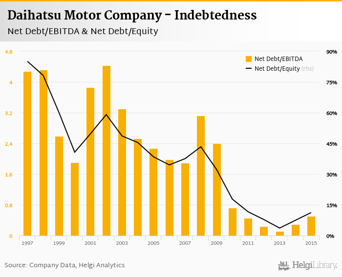 Daihatsu Motor Company's net debt stood at JPY 82.9 bil and accounted for 11.2% of equity at the end of 2015. The ratio is up 3.77 pp compared to the previous year.