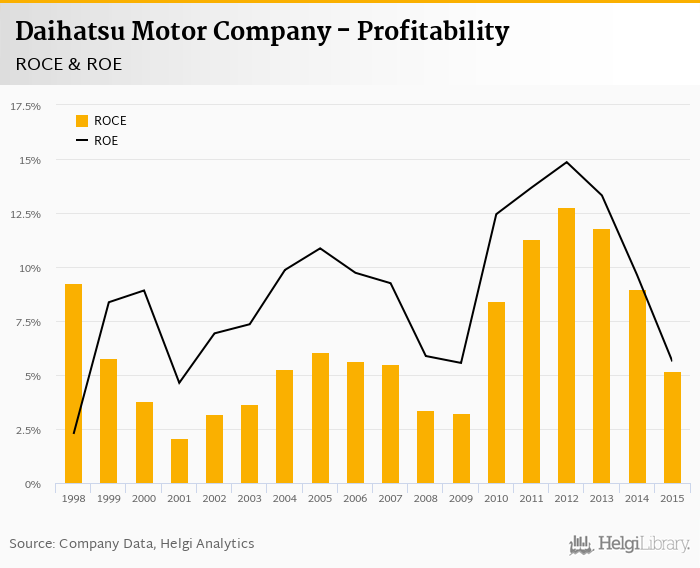 As far as Daihatsu Motor Company's peers are concerned, Toyota Motor Corporation generated ROE of 12.9% and ROCE of 6.12% in 2015. Mazda Motor Corporation's profitability reached 14.4% and 9.82%, respectively. Nissan Motor Company operated with 10.3% and 7.16% returns in 2015.