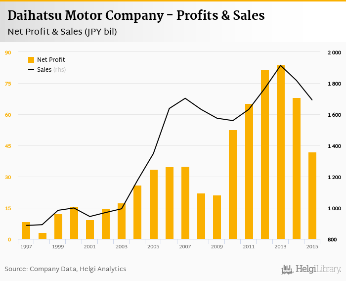 As far as Daihatsu Motor Company's peers are concerned, Toyota Motor Corporation posted a net profit and sales of JPY 2,313 bil and JPY 28,403 bil in 2015, Mazda Motor Corporation generated a net profit of JPY 134 bil (with sales of JPY 3,407 bil), and Nissan Motor Company netted USD JPY 524 bil (sales of JPY 12,190 bil).