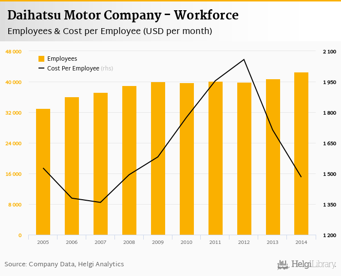 Daihatsu Motor Company employed 42,575 employees in 2014, up 4.45% compared to the previous year. Historically, between 1994 and 2014, the firm's workforce hit a high of 42,575 employees in 2014 and a low of 21,304 employees in 1997.