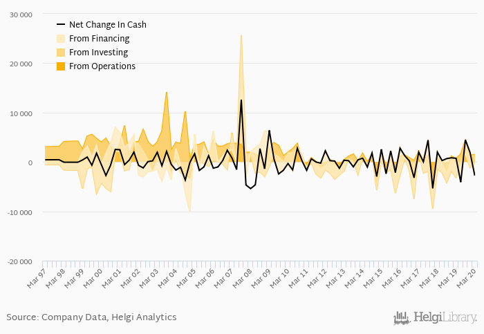 Cash from financing amounted to EUR -2,596 mil, so the company generated EUR -2,743 mil net cash in 1Q2020.