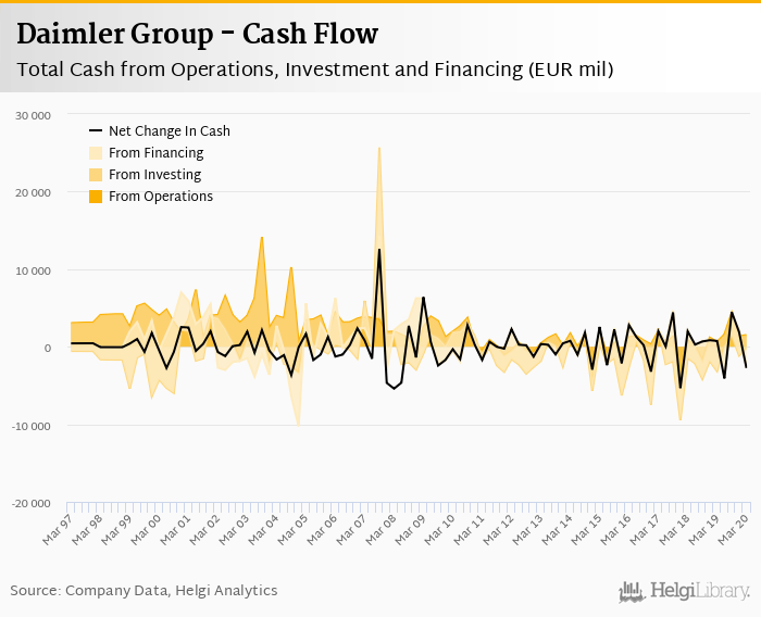 Daimler Group's operating cash flow stood at EUR 1,510 mil in 1Q2020, up 144% when compared to the previous year. Historically, between 1Q1997 - 1Q2020, the firm’s operating cash flow reached a high of EUR 14,114 mil in 3Q2003 and a low of EUR -5,467 mil in 4Q2017.