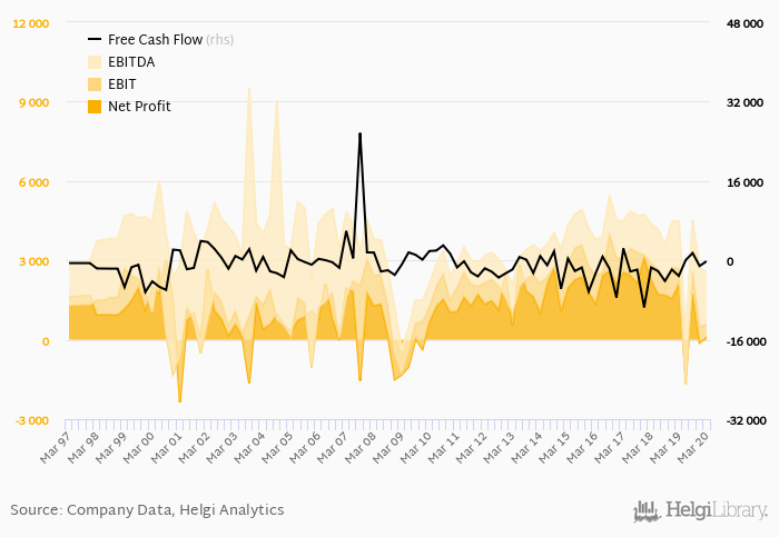 The company generated cash, defined by a sum of net profit and depreciation, of EUR 1,621 mil or 4.35% of sales. When investments are excluded, free cash flow reached EUR -183 mil, or -0.492% of sales in 1Q2020.