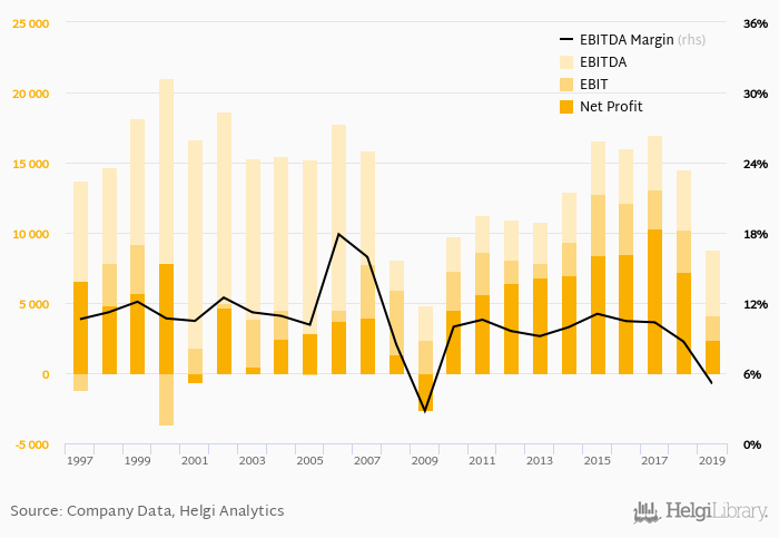 Historically, between 1997 - 2019, the firm’s net profit reached a high of EUR 10,278 mil in 2017 and a low of EUR -2,640 mil in 2009. Since 2014, the firm's net profit has decreased 65.9% or -19.3% a year on average.
