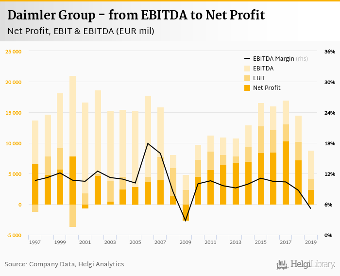 Daimler Group made a net profit of EUR 2,377 mil with revenues of EUR 172,745 mil in 2019, down by 67.2% and up by 3.22%, respectively, compared to the previous year. This translates into a net margin of 1.38%.