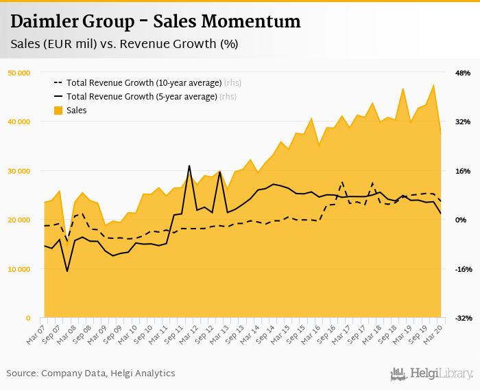 Daimler Group generated sales of EUR 37,223 mil in 1Q2020, down 6.23% compared to the previous year. Historically, between 1Q1997 and 1Q2020, the company’s sales reached a high of EUR 47,127 mil in 4Q2019 and a low of EUR 12,942 mil in 4Q2006.