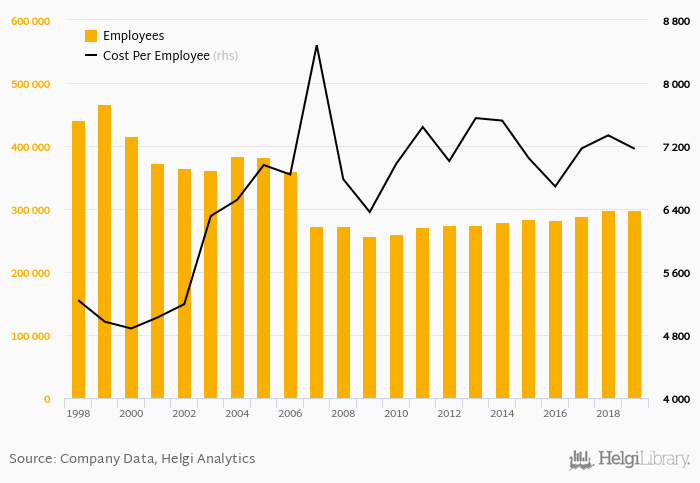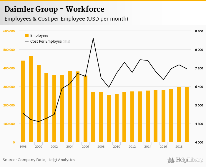 Daimler Group employed 298,655 employees in 2019, up 0.064% compared to the previous year. Historically, between 1998 and 2019, the firm's workforce hit a high of 466,938 employees in 1999 and a low of 256,407 employees in 2009.