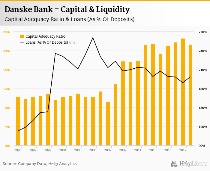 Danske Bank's capital adequacy ratio reached 21.3% at the end of 2018, down from 22.6% compared to the previous year. Historically, the bank’s capital ratio hit an all time high of 22.6% in 2017 and an all time low of 9.28% in 2007.