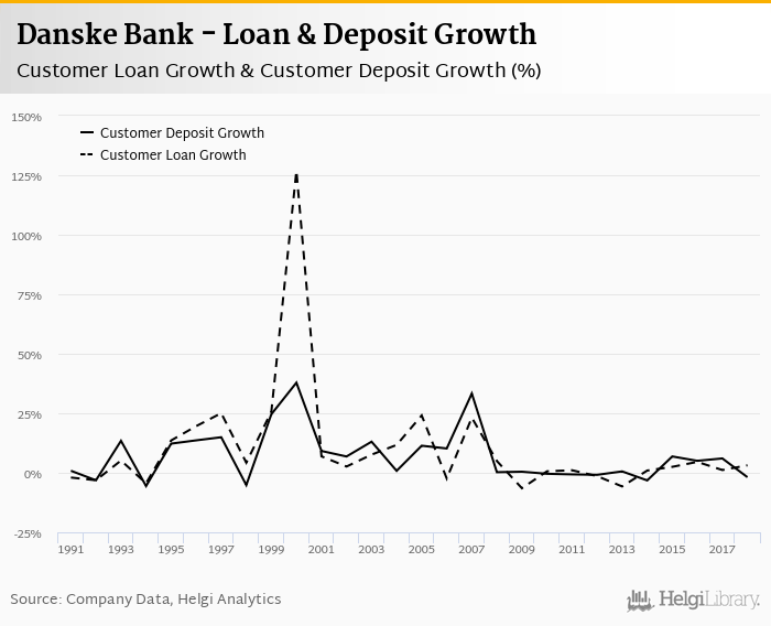Danske Bank's customer loan growth reached 3.15% in 2018, up from 1.16% compared to the previous year. Historically, the bank’s loans growth reached an all time high of 127% in 2000 and an all time low of -6.48% in 2009. In the last decade, the average annual loan growth amounted to -0.018%.