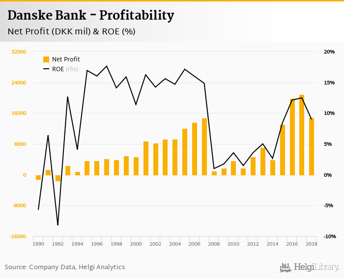 Historically, the bank’s net profit reached an all time high of DKK 20,900 mil in 2017 and an all time low of DKK -1,584 mil in 1992. The average profit in the last five years amounted to DKK 14,538 mil.