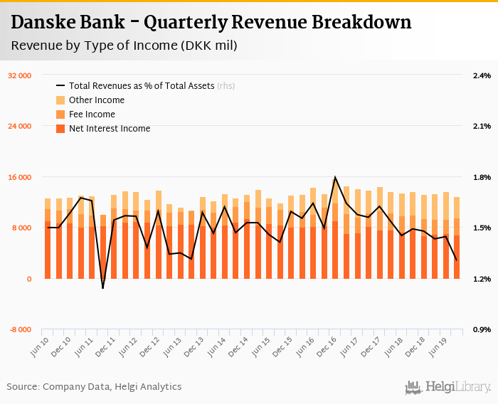Danske Bank generated total banking revenues of DKK 12,886 mil in the third quarter of 2019, down 5.76% when compared to the same period of last year and 5.51% when compared to the previous quarter.