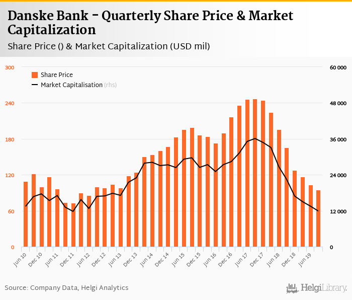 Danske Bank stock traded at 95.3 per share at the end of third quarter of 2019 implying a market capitalization of USD 11,877 mil.