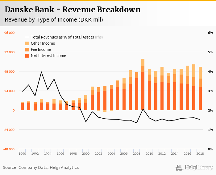 Danske Bank generated total banking revenues of DKK 53,887 mil in 2018, down 5.07% compared to the previous year.