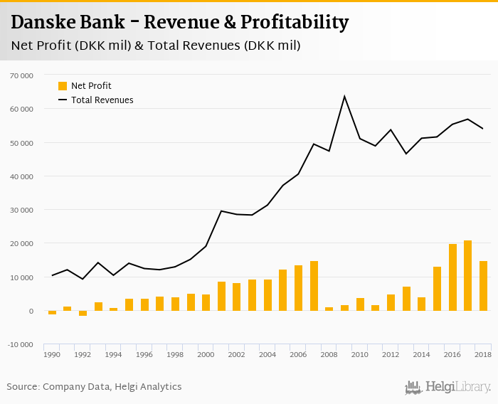 Danske Bank made a net profit of DKK 14,862 mil under revenues of DKK 53,887 mil in 2018, up -28.9% and -5.07% respectively compared to the previous year.