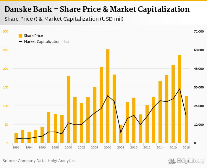 Danske Bank stock traded at 126 per share at the end of 2018 implying a market capitalization of USD 16,901 mil.