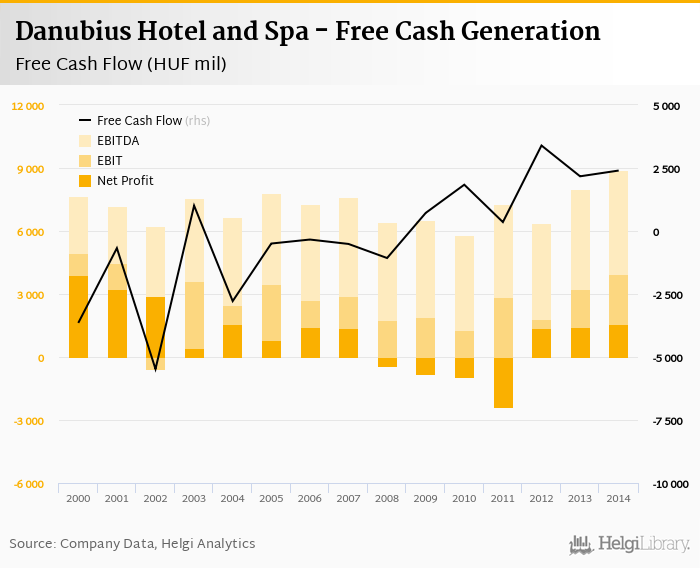 Danubius Hotel and Spa made a net profit of HUF 1,566 mil with revenues of HUF 52,332 mil in 2014, up by 9.51% and up by 4.5%, respectively, compared to the previous year. This translates into a net margin of 2.99%.