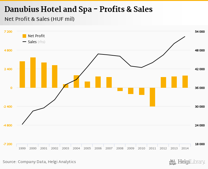 Danubius Hotel and Spa made a net profit of HUF 1,566 mil in 2014, up 9.51% compared to the previous year. Total sales reached HUF 52,332 mil, which is up 4.5% when compared to the previous year.