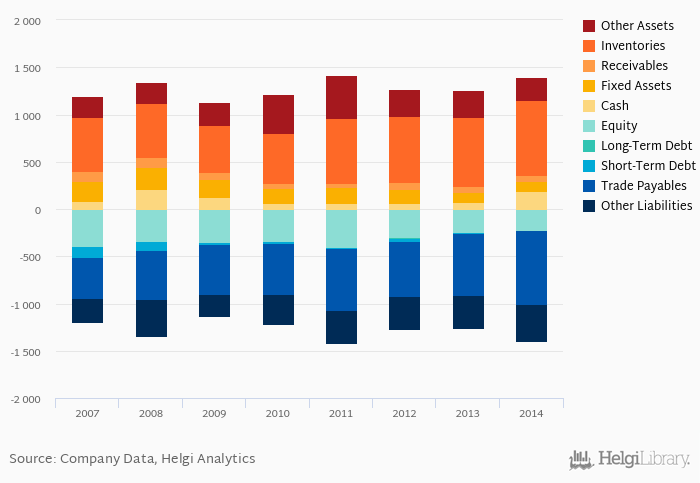 Net debt against equity is down 58.3 pp from five years ago (-29.1%). The ratio against EBITDA decreased from -0.854x seen in 2009 to -1.61x.
