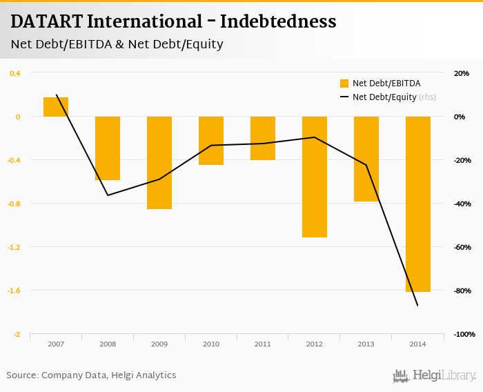 DATART International's net debt stood at CZK -190 mil and accounted for -87.4% of equity at the end of 2014. The ratio is down 64.8 pp compared to the previous year.