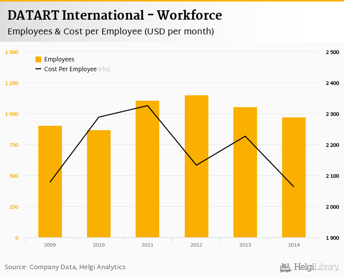 DATART International employed 973 employees in 2014, down 7.77% compared to the previous year. Historically, between 2009 and 2014, the firm's workforce hit a high of 1,150 employees in 2012 and a low of 870 employees in 2010.