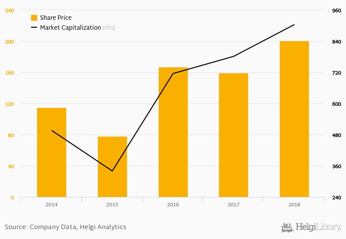 Since the end of 2013, the stock has appreciated by % implying an annual average growth of 0 %. In absolute terms, the value of the company rose by USD 904 mil.