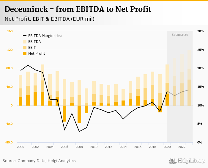 Deceuninck made a net profit of EUR 24.2 mil with revenues of EUR 642 mil in 2020, up by 262% and up by 1.32%, respectively, compared to the previous year. This translates into a net margin of 3.77%.