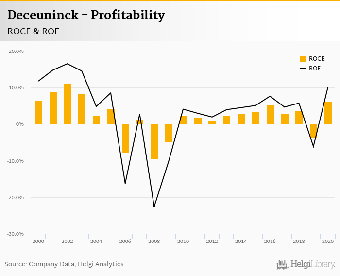 Deceuninck made a net profit of EUR 24.2 mil in 2020, up 262% compared to the previous year. Historically, between 2000 and 2020, the company's net profit reached a high of EUR 29.6 mil in 2002 and a low of EUR -37.4 mil in 2008.