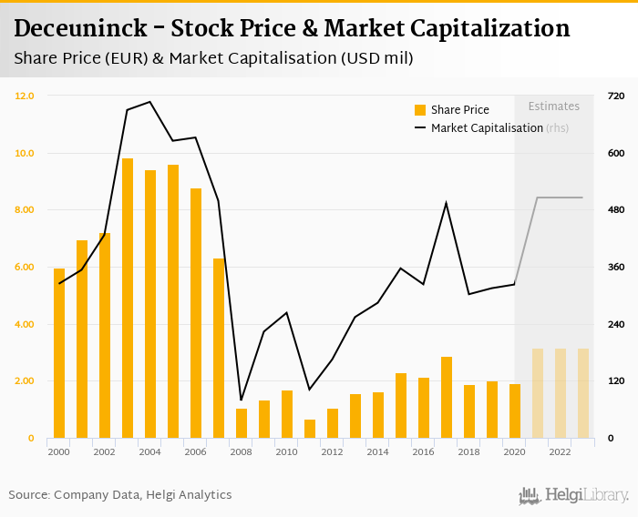 Deceuninck stock traded at EUR 1.93 per share at the end 2020 implying a market capitalization of USD 323 mil.