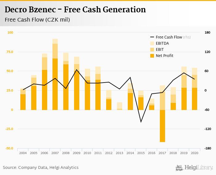 The company generated cash, defined by a sum of net profit and depreciation, of CZK 37.8 mil or 9.63% of sales. When investments are excluded, free cash flow reached CZK 34.3 mil, or 8.73% of sales in 2020.