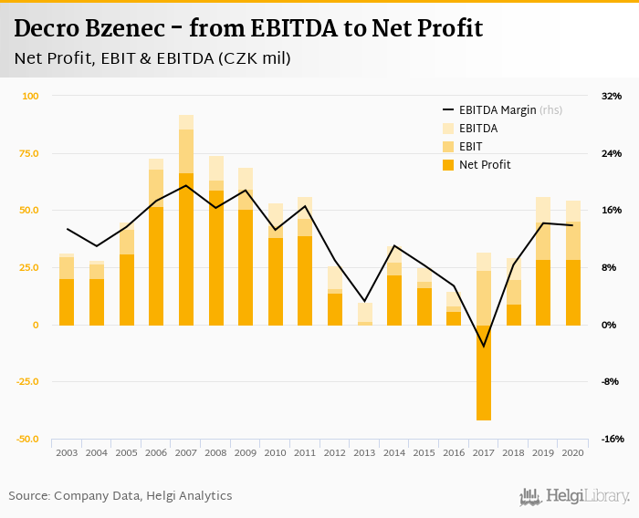 Decro Bzenec made a net profit of CZK 28.6 mil with revenues of CZK 393 mil in 2020, up by 0.196% and down by 0.523%, respectively, compared to the previous year. This translates into a net margin of 7.27%.