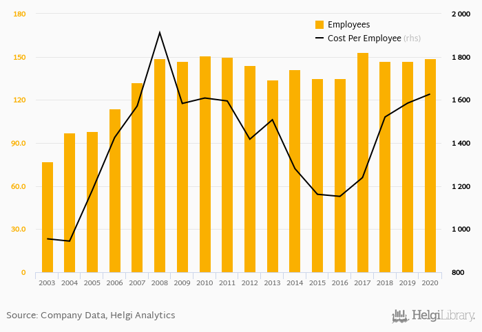 Staff cost represented 16.3% of sales in 2020, 2.44 pp higher than a decade ago.