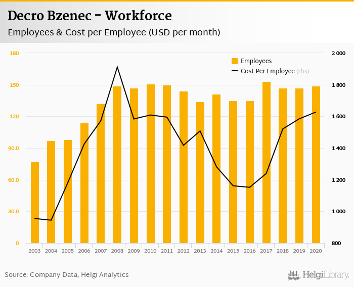 Decro Bzenec employed 149 employees in 2020, up 1.36% compared to the previous year. Historically, between 2003 and 2020, the firm's workforce hit a high of 153 employees in 2017 and a low of 77.0 employees in 2003.