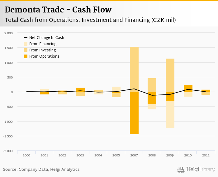 Demonta Trade's operating cash flow stood at CZK 72.1 mil in 2011, down 69.5% when compared to the previous year. Historically, between 2000 - 2011, the firm’s operating cash flow reached a high of CZK 236 mil in 2010 and a low of CZK -1,444 mil in 2007.