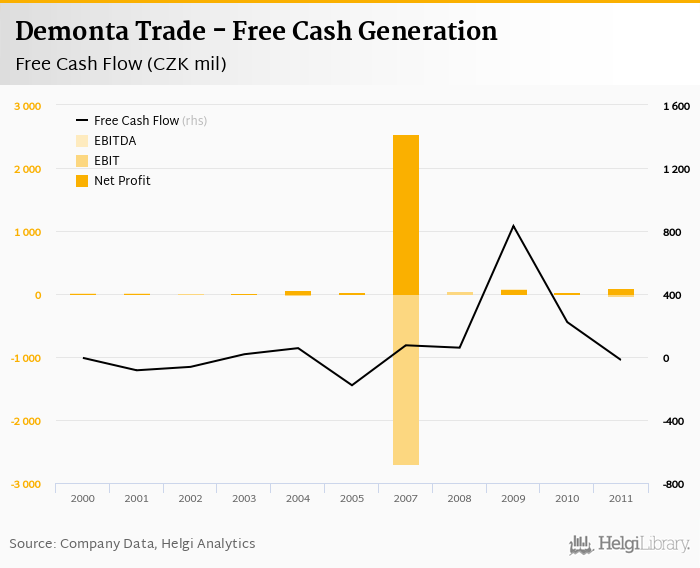 Demonta Trade made a net profit of CZK 96.2 mil with revenues of CZK 2,290 mil in 2011, up by 271% and up by 5.7%, respectively, compared to the previous year. This translates into a net margin of 4.20%.