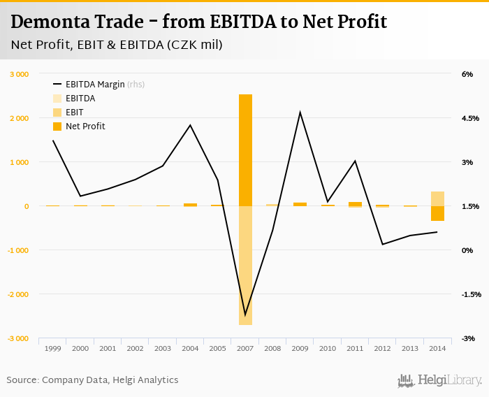 Demonta Trade made a net profit of CZK -327 mil with revenues of CZK 1,042 mil in 2014, down by 2% and down by 25.4%, respectively, compared to the previous year. This translates into a net margin of -31.4%.